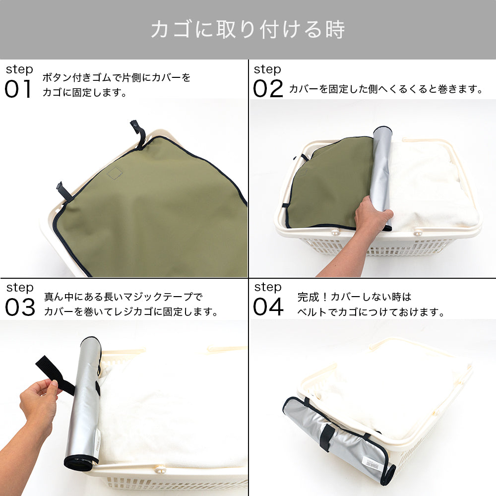 このレジカゴカバーなら、レジカゴに取り付けたまま、お買い物でき、お会計が終わればサッと被せて覆うだけで、